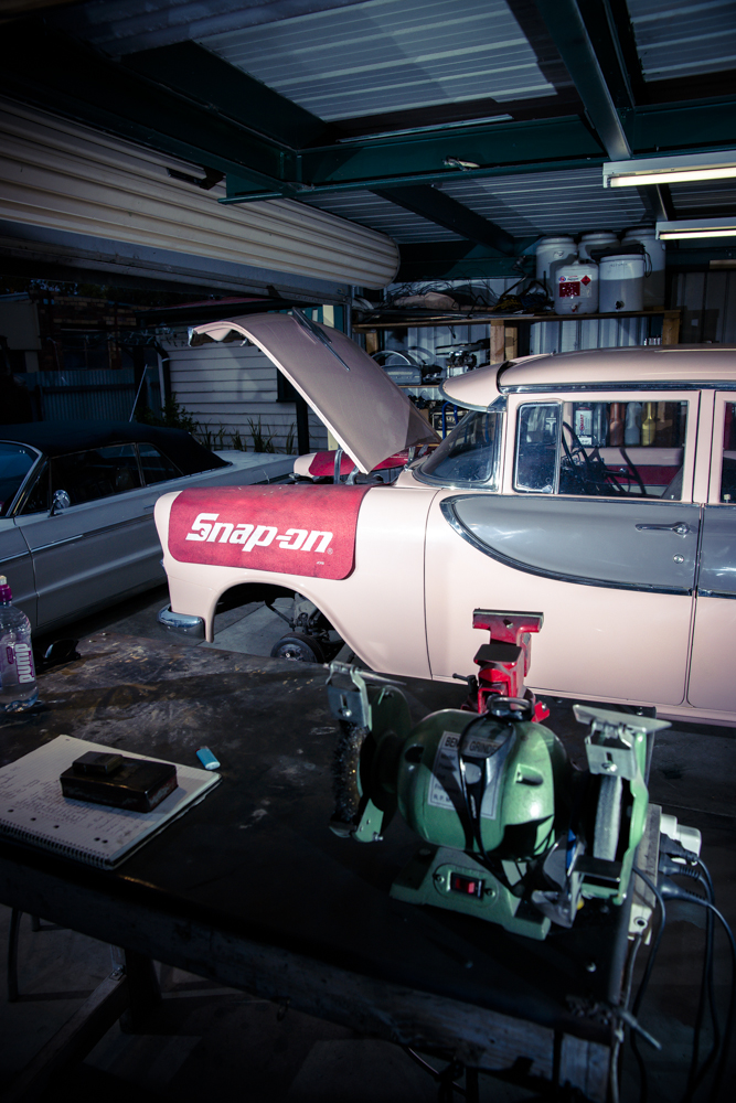 While photographing this “back to the good ol days” style of workshop, I met the club Andy is a member of. The Gas Axes is a small club consisting of Andy and Elle, Justin and Alison, Gareth and Kylie and Bart Verducci. Justin explains how the club came about. “A year and a half ago we started a burger night once a week in winter, everyone hibernates from the cold weather so we decided to do something about it and have a night out and that evolved into the Gas Axes. We’re all like-minded people and Wednesdays and Thursdays is about the cars and we all get together. It’s a great midweek break.” These cool cats can also be found hanging out at most rockabilly festivals with their rides.