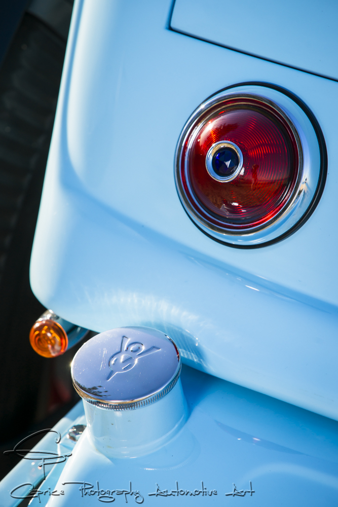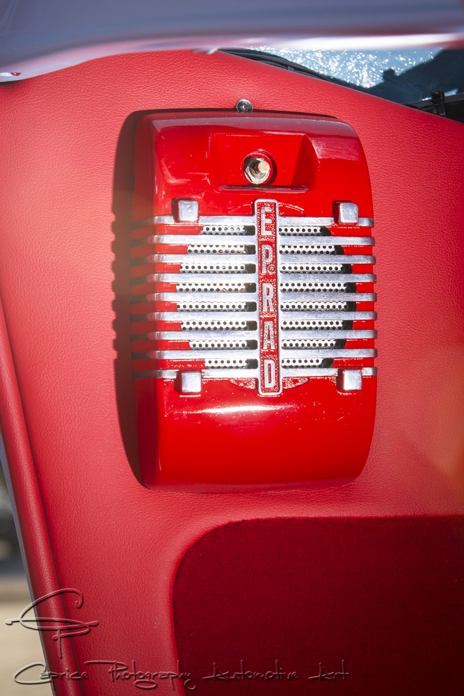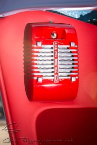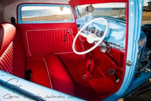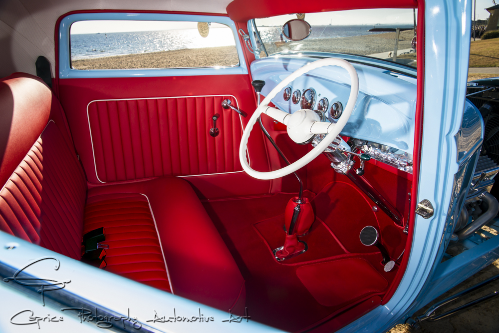 That sixties old school rodding theme can be found throughout the interior as well from the contrasting red tuck n roll interior which was a must on Mario’s wish list through to the perforated white vinyl headlining and piping. An aftermarket 1940s column and wheel create that hard line style while So-Cal gauges fill the baby blue dash. “I like the So-Cal product” says Mario “It (the rod) has got a lot of So-Cal on it as you can see.” The more unique details of the interior and testimony to Mario’s tastes are the 57 Chev handles and winders as well as the old drive-in speaker covers. Pat Mesiti from Sunshine Motor Trimmers who expertly stitched the interior came up with the idea. “I had them at home and the trimmer, Pat said they’d look good as speaker covers. I painted and polished them and Pat put them in.” The rest of the stereo is tucked away out of sight.