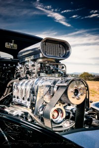 Paul’s list of mods was short but not subtle! “You’ve gotta have a blower on a Willys and leave the bonnet off” he said so a new engine was the go. Built by Brian Cassar from …………. the new donk sported much the same displacement as the previous donk but with massive induction via a 671 blower and twin Holleys. “I wanted the same sort of horsepower but having the blower on it increased the horsepower to 640″. He had the T700 beefed up by Paul Rogers to handle the extra grunt while out back sits the full floating nine inch hung in place by four bars. Up front is a Mustang II kit purpose built for rodding a Willys. No airbags for this wild ride with ride height as you see it looked after by coil over shockers in all corners and stopping power influenced by four wheel discs.