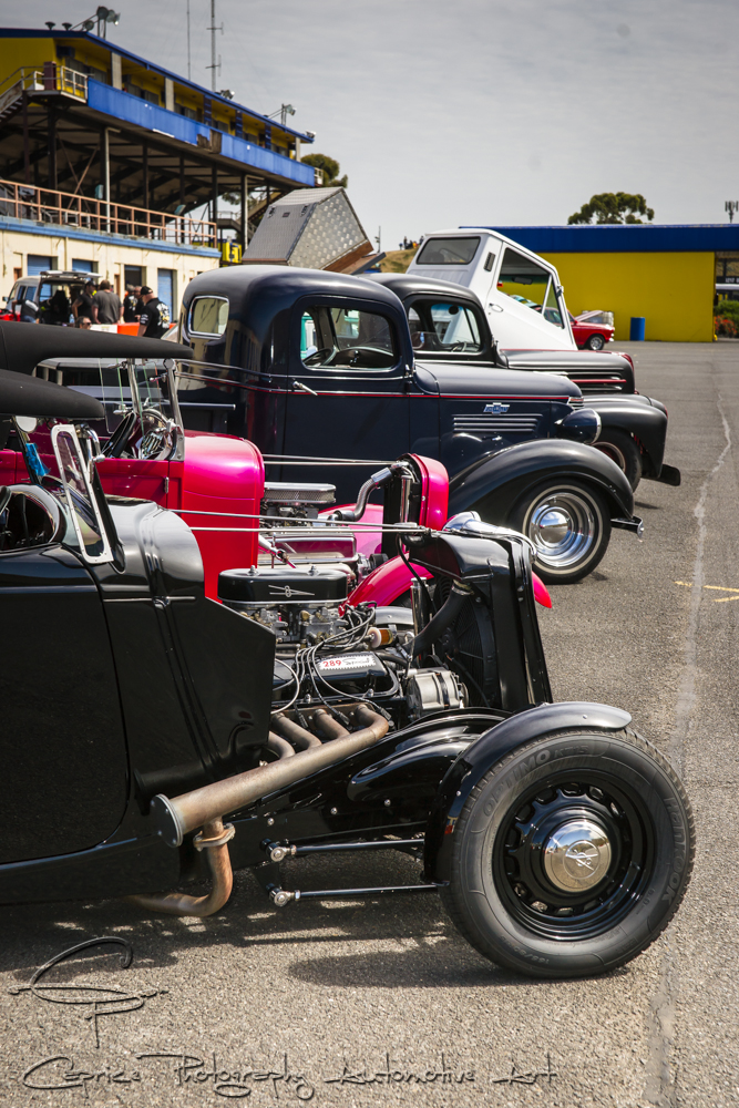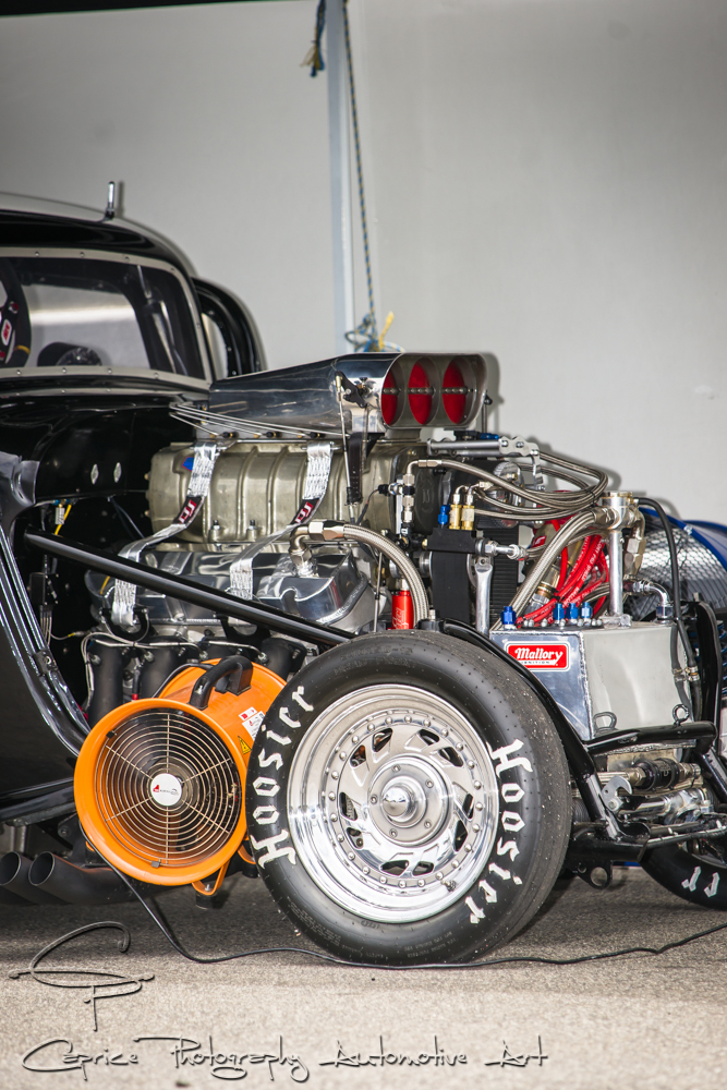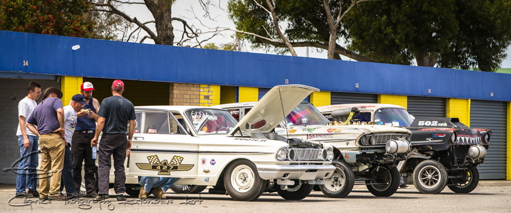 Over 150 classic cruisers and rods parked up on the black top carpark while the drivers and co took in the frantic activities of the pits as racers and crew went about fine tuning their high horsepower rockets. Everything from Street Outlaw class rides to old school gassers and wild rods could be found throughout the pit area. The only time the pace slowed down was when the welcome distraction of the stunning Kingpin models, Dahlia Black and Katarina Sin strolled through the pits much to the delight of the racers and crews. Plenty of photo opportunities were taken advantage of as the girls’ slender figures created a juxtaposition with the hard edged curves of the highly modified metal machines.