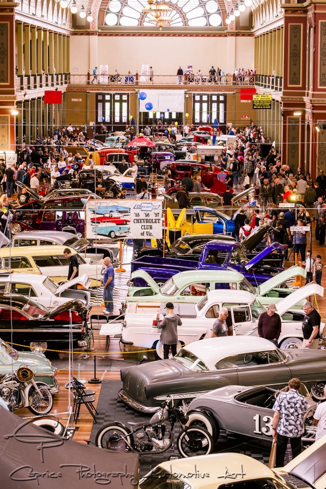 Inside the main hall under the decorative arches, a wide selection of pristine automotive machinery could be scrutinized over, thanks to stunning displays of chrome, lighting and mirrors. Complementing the elite class of cars and bikes were regularly driven, personally styled rods and rides encompassing the wider scope of our classic automotive scene in all its glory.