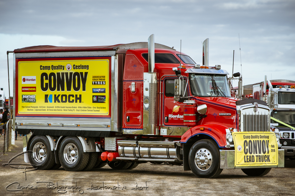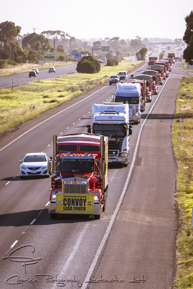 The bikes took off first as they cruised two abreast before the big rigs fired up for their trip through the bay side city of Geelong to the showgrounds. Leading the convoy of trucks was Riordan Grain Services who won the privilege with a winning bid of $23,750 at the previously organised auction with all monies raised going to Camp Quality.