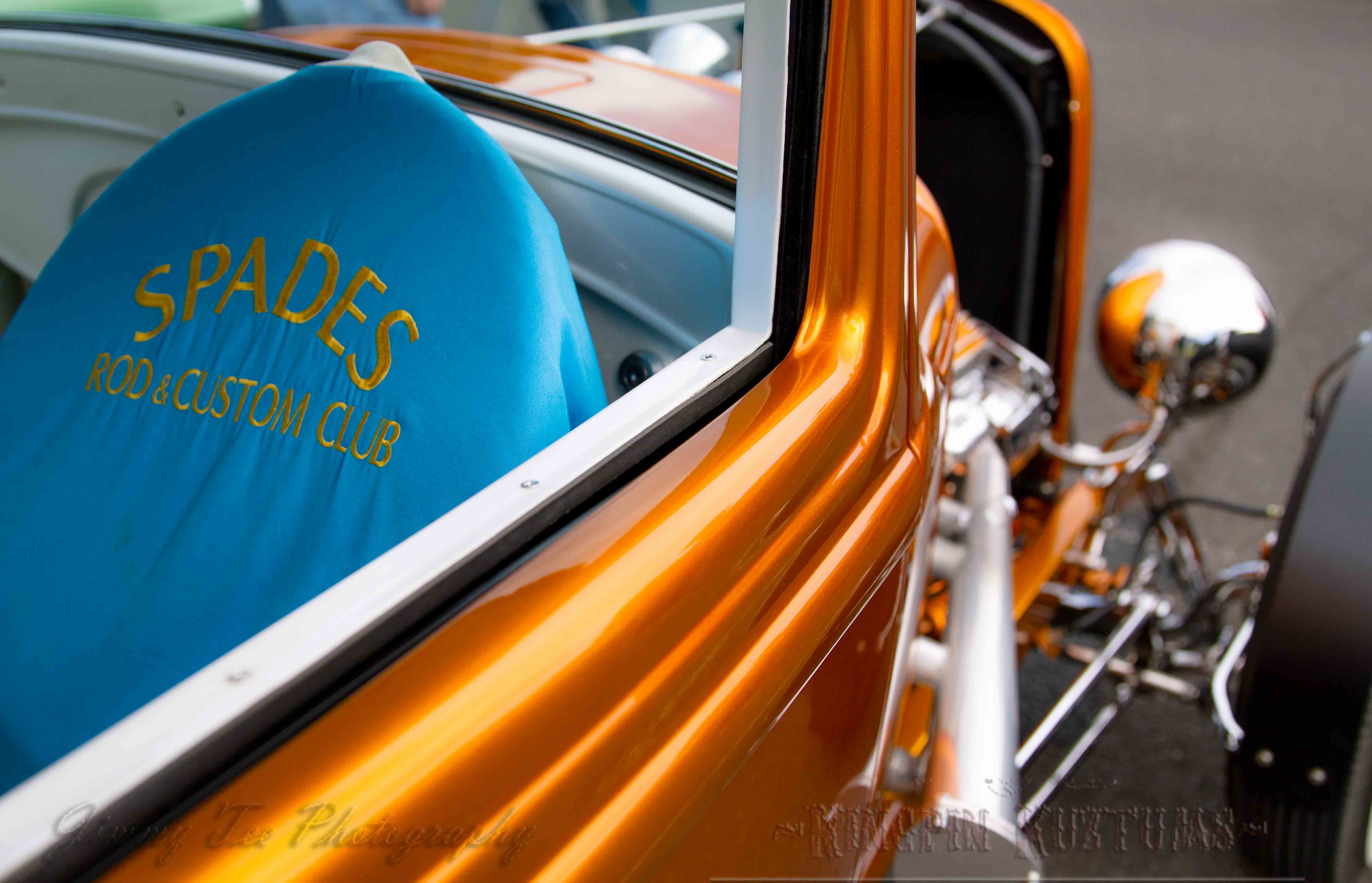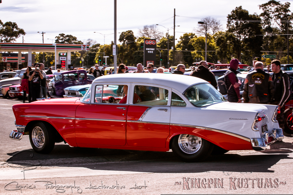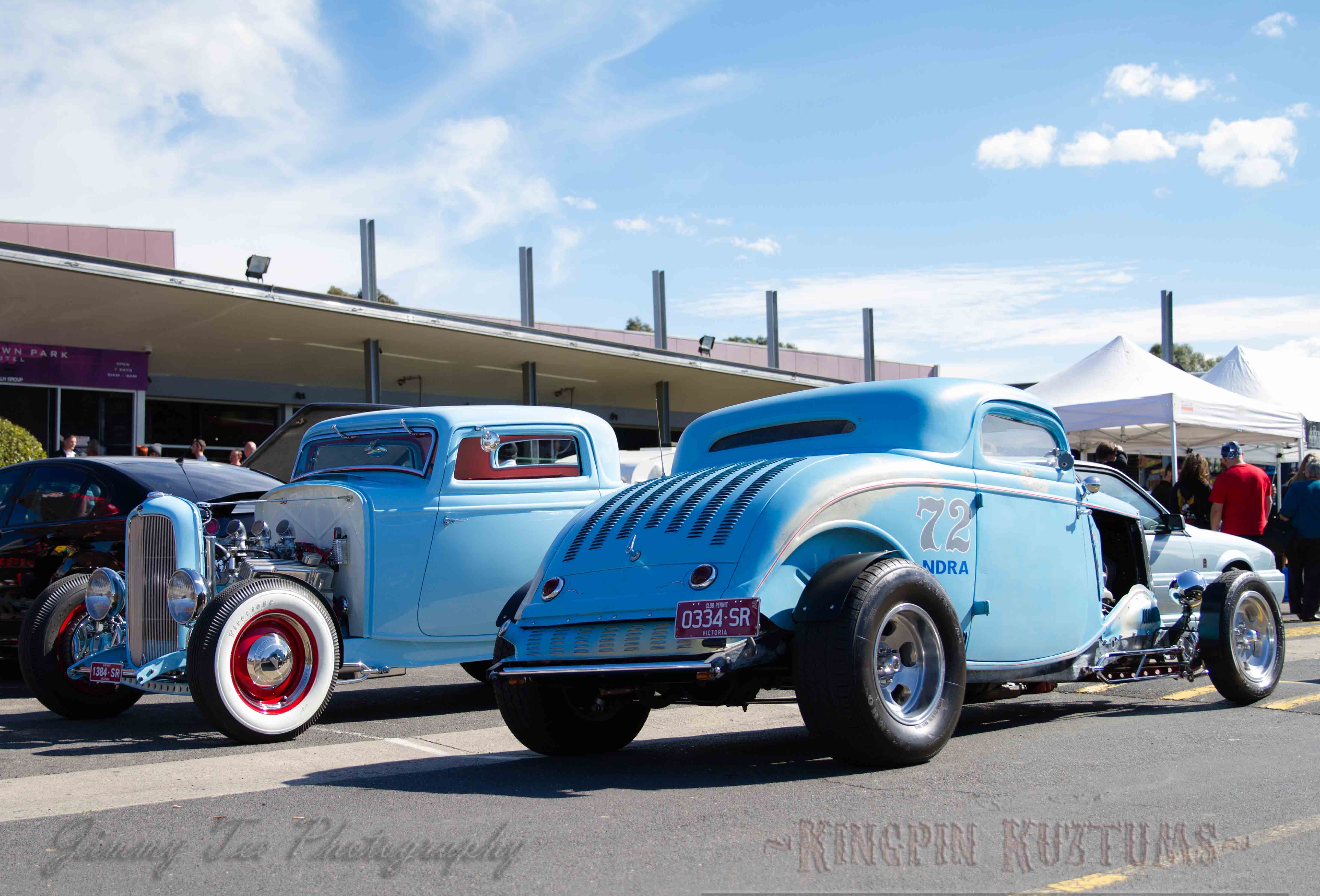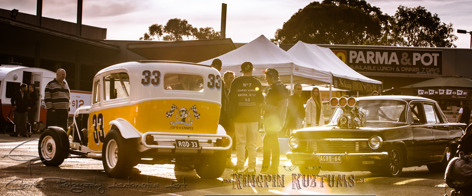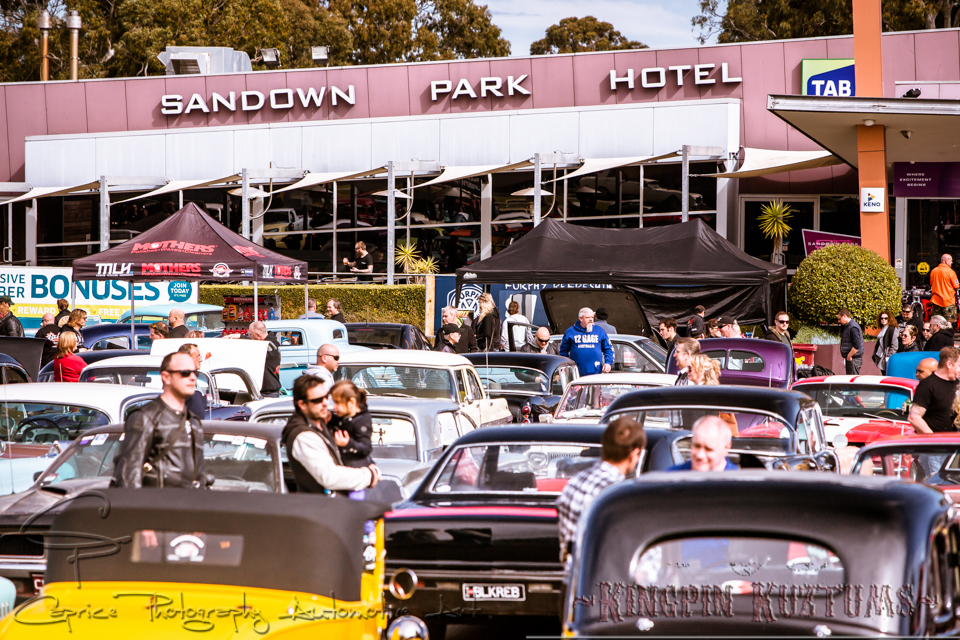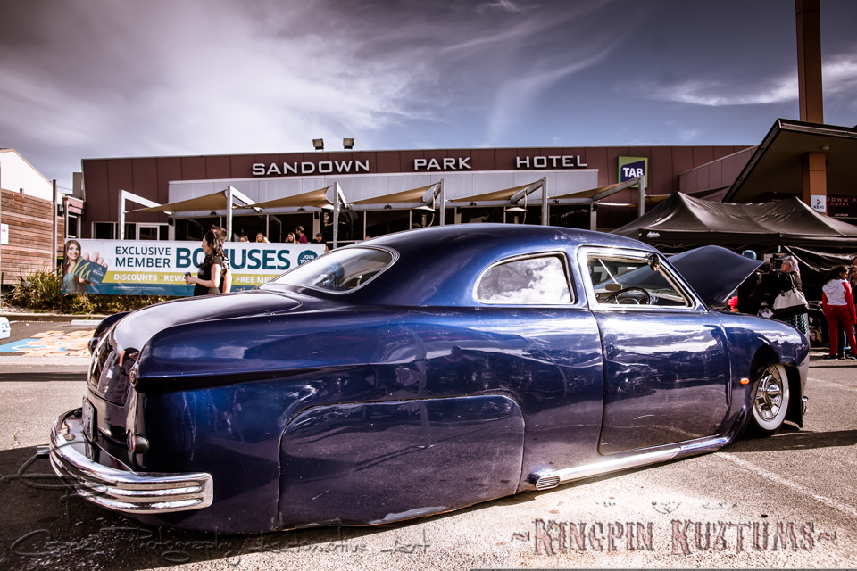 My wandering mind was interrupted by low rumbling roar of the distinctive sound created by a hoard of Harleys, drawing my attention to window as I gazed upon a large group of leather clad riders cruising down Dandenong Rd before turning into the Sandown Park Hotel car park. “Shit” I thought, “I better get my butt into gear!” As I stepped outside into the warming sunshine, I gazed upon the huge parking area before me. The curvaceous shapes of rods, customs and classics glistened in the morning sun while off to my right, the arriving Harley Davidsons motored into the carnival area, settling in amongst the multitude of custom and chrome two wheelers which had already perused in earlier. This was looking like another huge Kingpin Kuztum event!