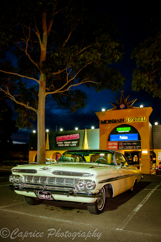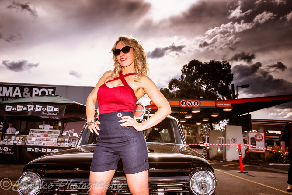 As I sat in my hotel room on Sunday morning at my makeshift work station, lap top open editing the previous night’s photography from the warm up party at The Monash Hotel, my mind wandered over the events of the evening. While there was a hive of activity in the venue itself thanks to the two great rockabilly bands scheduled to entertain the patrons throughout the evening, local heroes Itchy Fingers and the highly anticipated Queensland five piece, A Band Called Twang, the car park itself remained fairly quiet with a handful of dedicated cruisers braving the chilly night air to come on down for a look and a listen. Don’t get me wrong, the variety of rides spread amongst the tree-lined parking lot were pretty cool in their own rite, from a tough 67 Chevelle, a matt black custom 49 Merc through to a ground scraping Beetle and a traditional style flathead roadster contrasting against the big American classics glistening under the street lights just to paint a picture for you! Shining a like a beacon in the night was the distinctive red and white coffee van of Betty & Ruby, on hand for anyone looking to warm up their hands and hearts around a hot brew!