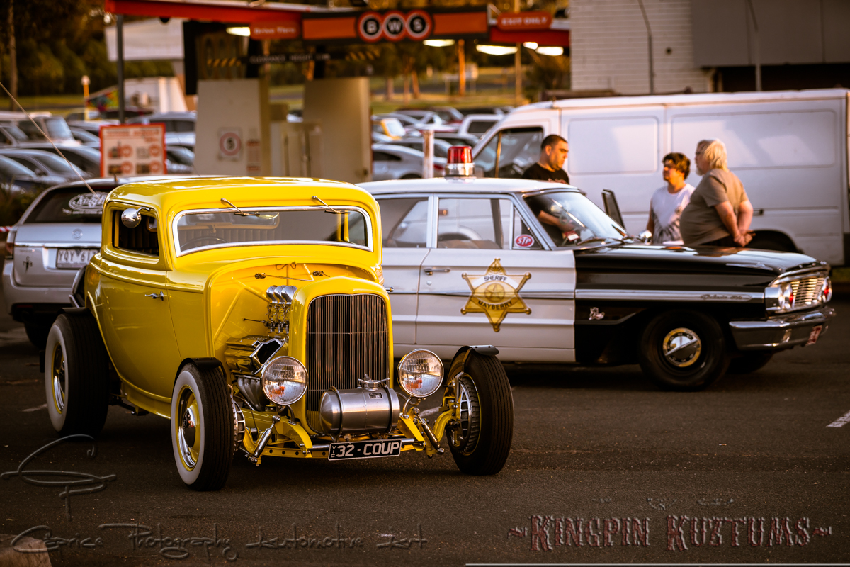 The Big Bad Wolf social club is still in its infancy but is really starting to get traction amongst the hot rodders, car cruisers and rockabilly fans! I attended the final one for the year held at Sandown Park in Melbourne’s east. The movie for the night was a car lover’s classic, American Grafittii hence the 32, cop car and white Tbird on display out amongst the rods and rides.