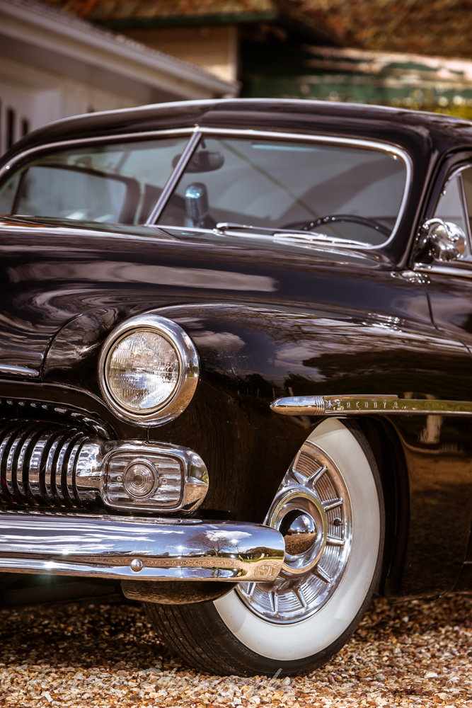 Outside mods are limited as Craig felt this particular Mercury was too good to mess with due to its sound floors and no rust. “I’ve always had a soft spot for chopped mercs but this one is too good to chop. It’s very original with no rust. If I didn’t have the other one with the chopped roof, you could maybe twist my arm!” Craig explains. Metal spats off a 51 model Merc were restored to original condition to sit comfortably over the rear for the tail floating stance, while a 51 bullet style steering wheel was also added up front just to confuse us Mercury novices. Other subtle modifications can be found but are generally only recognised by diehard fans, such as the colour of the Mercury god head on the boot handle, blue dot taillights and the removal of the hood ornament and front over-riders.