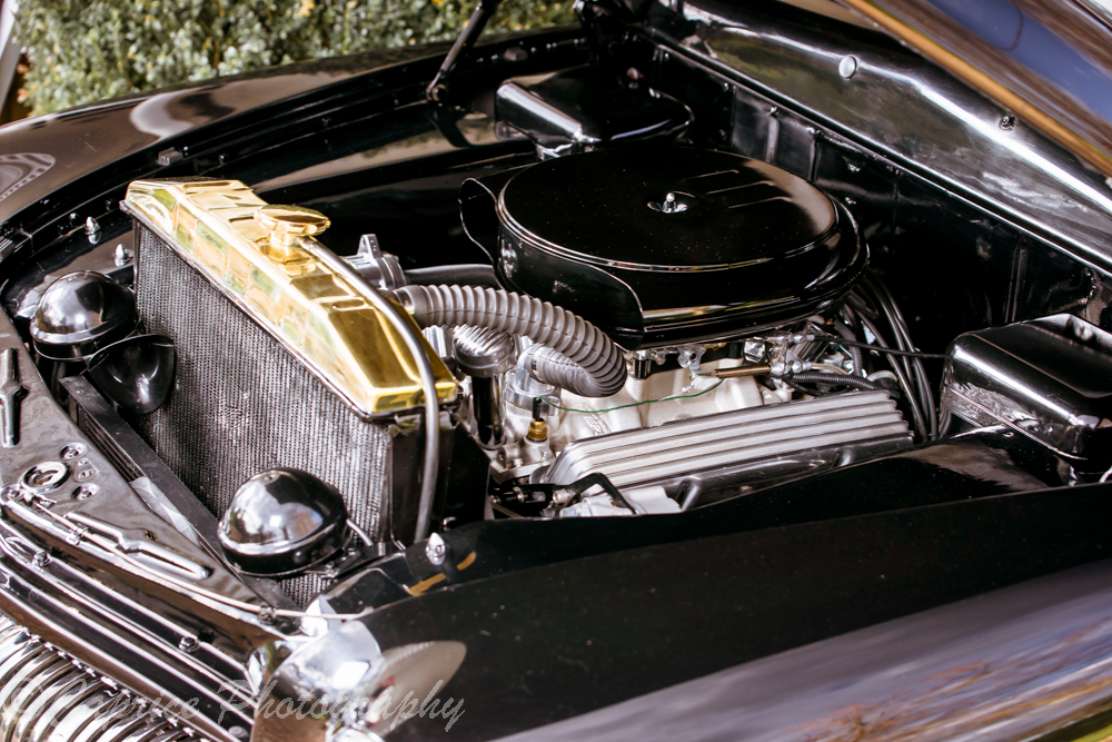 When peering inside at the period style interior, your attention is caught by the uber-cool, fifties era microphone head sitting tall on top of the Lokar shifter. This is one of Craig’s own styling ideas and throws back to his days as a lead singer in a band before settling down to focus on family and career. “I used to be in a band years ago and used one of these mics, plus I’m also a big Elvis fan. Also, the fins on the microphone blend in nicely with the style of the dash” reminisces Craig. What’s not visible are the creature comforts of heating and cooling thanks to a Vintage Air system installed under the dash. Craig utilised the original Mercury heater controls to operate the system.