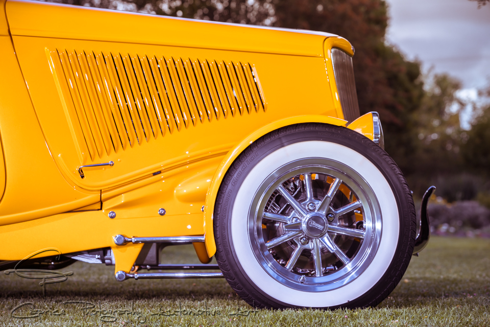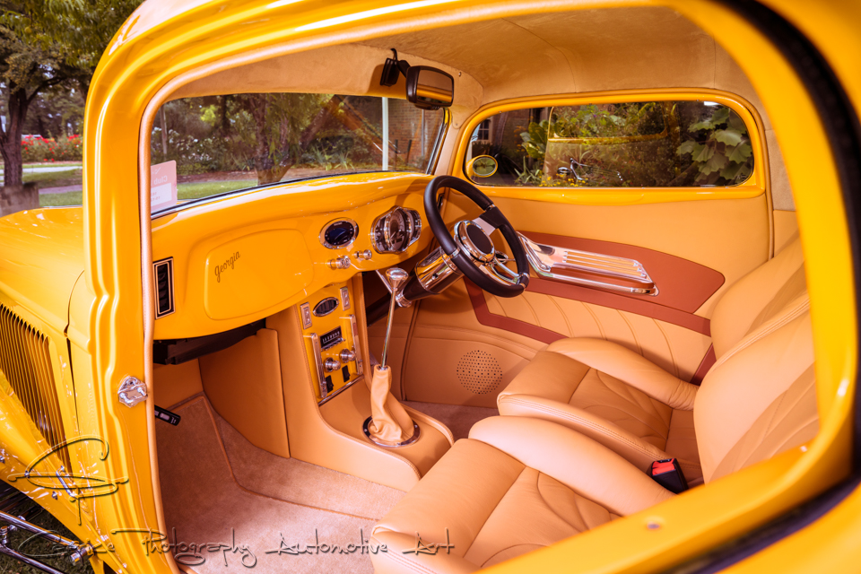 The stunning colour choice of this 48 year aspiration is a custom mix of past and present interests. “My family always give me a hard time about my colour choice saying “he’s buying another car. I bet it’s baby poo mustard again!” When it came time to choose the colour for the hot rod, My hot rodding brother Don kept saying to me “you’re not going to do baby poo mustard for the colour!?” to which I would say “it’ll be close but it’ll have a twist to it as I’ve seen another colour i like which is tangerine scream”. I happen to be in the Maccas carpark one day and there was a Ford Focus RS in this colour and when I looked into the crowded carpark, that was the only car that I could see. I spoke to Rowan Kenny about it and he said we could do it and even change it a bit. I said ” if we’re going to change it, I only want to add pearl. I guess when looking back at the whole build, the one thing that made me the most nervous was choosing the colour because it had to hit the vision I had in my head. Rowan was very patient with me and convinced me that we’d get it right. When the body was painted and we were delivering it back to Ian’s, the colour in the sun just popped. It’s a fantastic combination of what I originally wanted and playing around with Tangerine Scream and I’m stoked with the colour!”