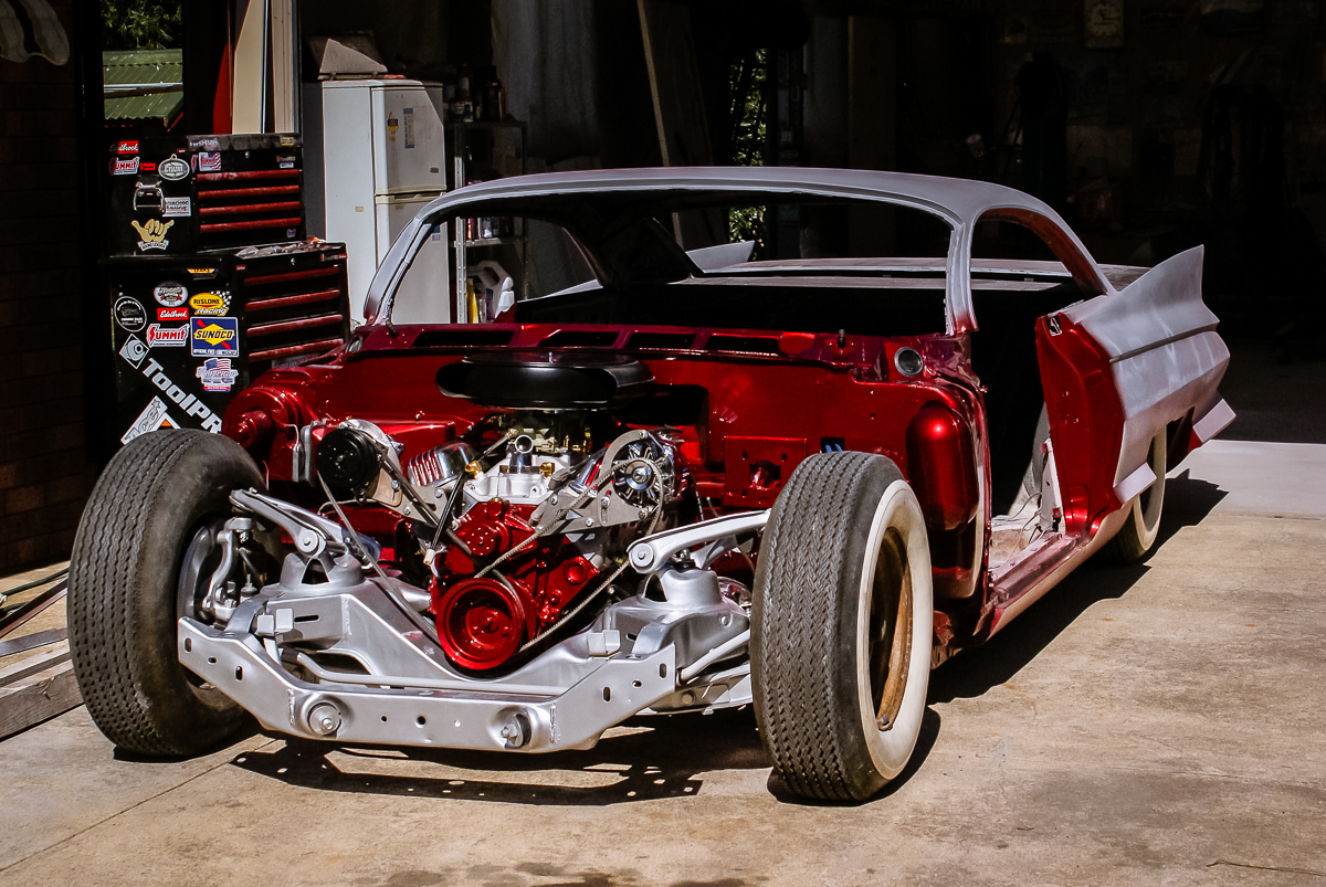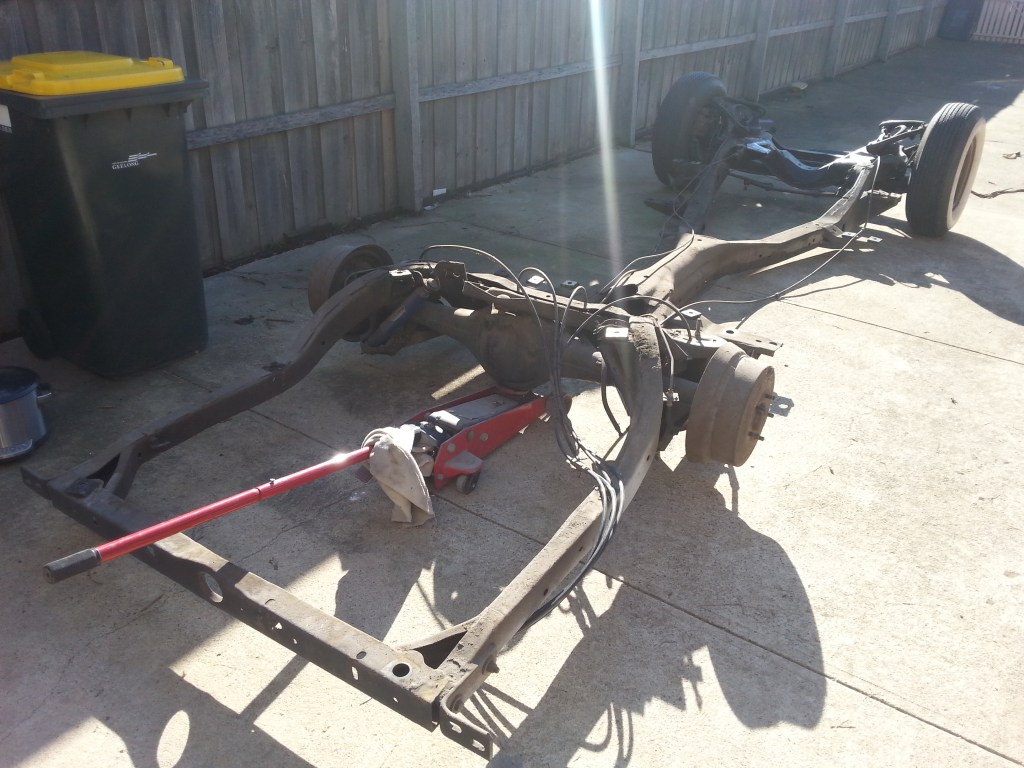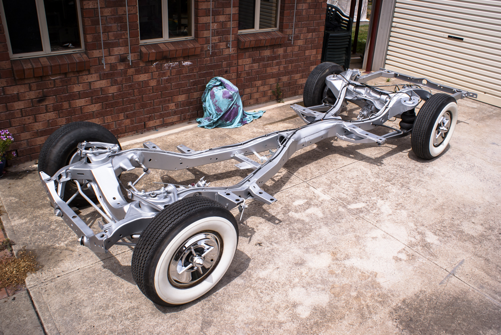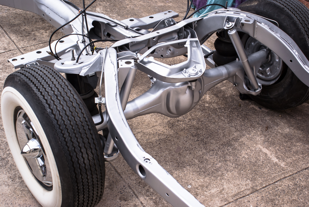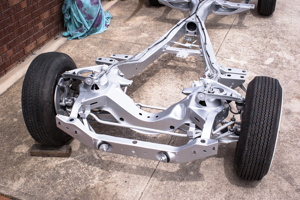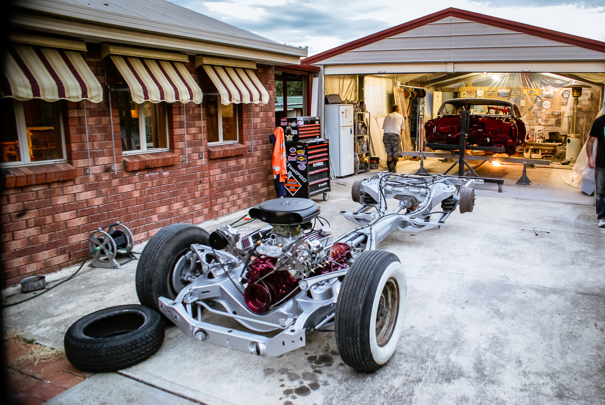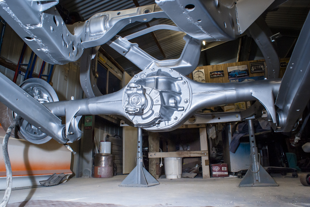During this time, I also took a closer look at the engine and built a new transmission to match the performance of the Chevy engine and the ratio of the 9-inch rear end. I meticulously tidied up both mechanical components before mating them together and finally reinstalling the running gear back into the chassis. However, since I had swapped out the initial T700R transmission with a T400, I had to modify the transmission mount and tailshaft. It’s funny how changing one thing affects another! Fortunately, Pete from A1 Automotive in Geelong extended the tailshaft and provided the correct driveshaft.