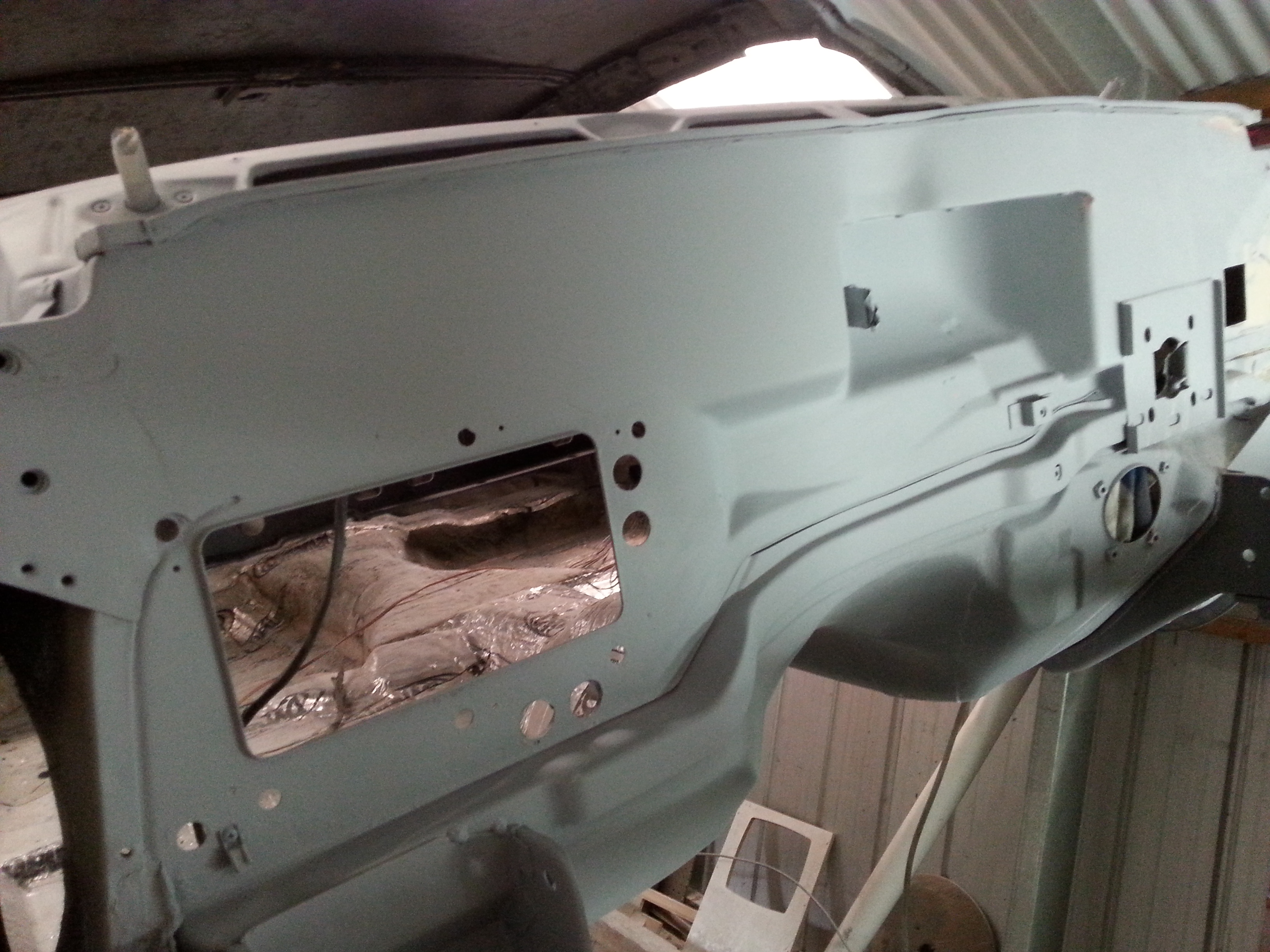 Moving on to the firewall, I wanted to achieve a seamless and tidy look. I filled in the various access panels and removed the overhanging lip above the wiper motor cavity. The heater box also needed attention, as it had a strangely placed temperature controller on the outside. I relocated it to the inside and replaced the vacuum-operated heater flap with an actuator, allowing me to eliminate the vacuum server. To further enhance the firewall’s appearance, I filled in the seam running across it.