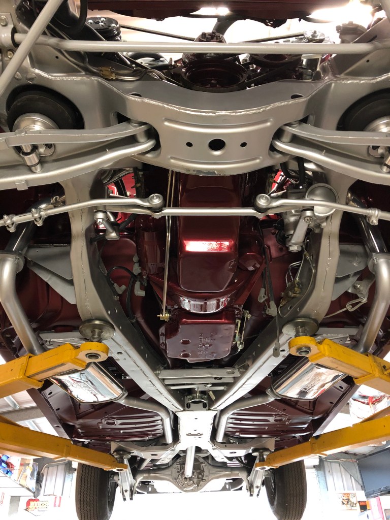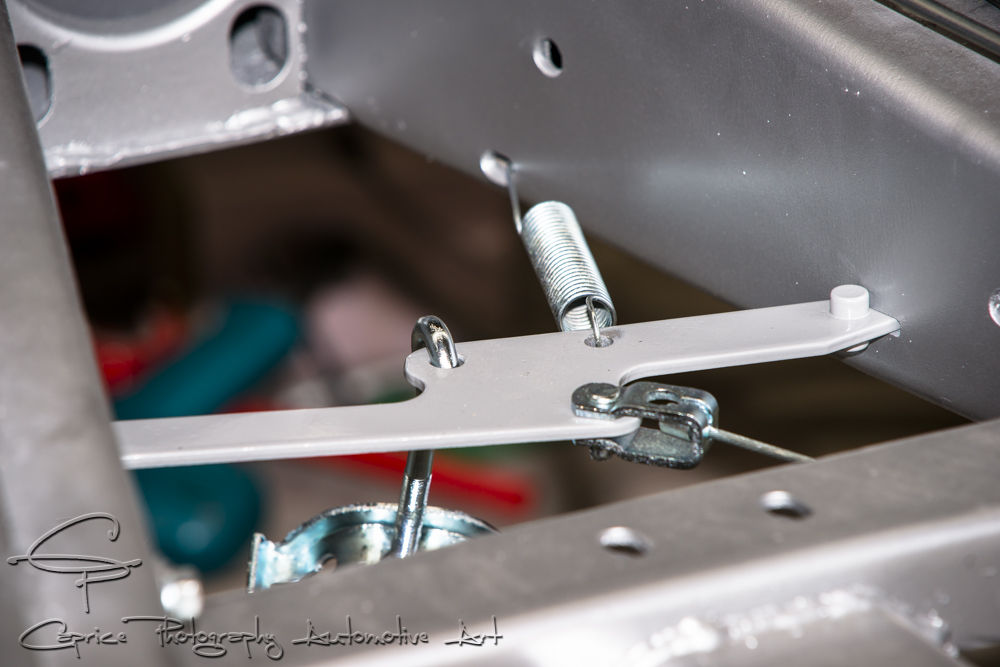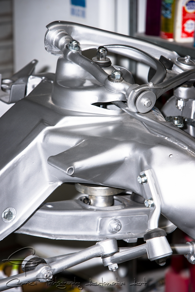 While the underside of the body and chassis had minimal rust for a car of this age, there were still dents from rocks and imperfections from the factory. It was a meticulous process of going over the entire floor, front to back, addressing each flaw and preparing it for primer and paint. Once the underside was ready, I turned my attention to the chassis, giving it a thorough clean-up and addressing any necessary repairs. I smoothed out various sections on the chassis and suspension parts to enhance the visual appeal when viewed from underneath, while still ensuring ease of cleaning. The chassis received a silver finish, complemented by zinc-coated nuts and bolts. Certain steering parts were powder coated in a matching silver color for added durability.
