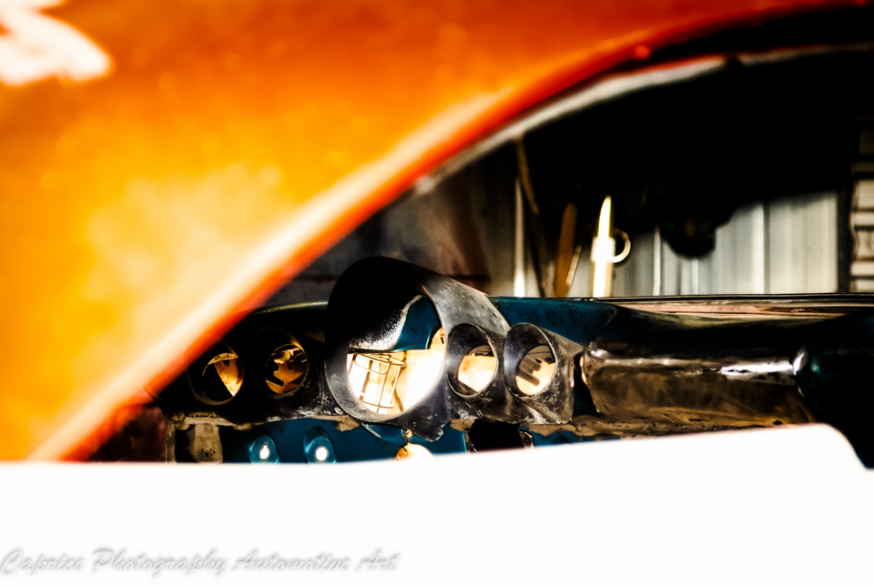To meld the column to the dash, I fashioned my own fill panel which also houses the universal trans selector glass. With a Turbo 400 in the car, none of the original items would suit. The gauges themselves are from the Classic Instruments range designed specifically for the 59-60 Impalas. My only beef with them is that the indicator and high beam lights that are located in the original speedo are not in the aftermarket unit. So therefore, I was left to find a suitable location for these three lights. I have strategically placed them below the speedo in the fill panel but blacked them out so as to not draw attention when not in use. The gauge pods themselves have been finished in a high flek silver for full kustom effect thanks to Luke from Lukeydidit