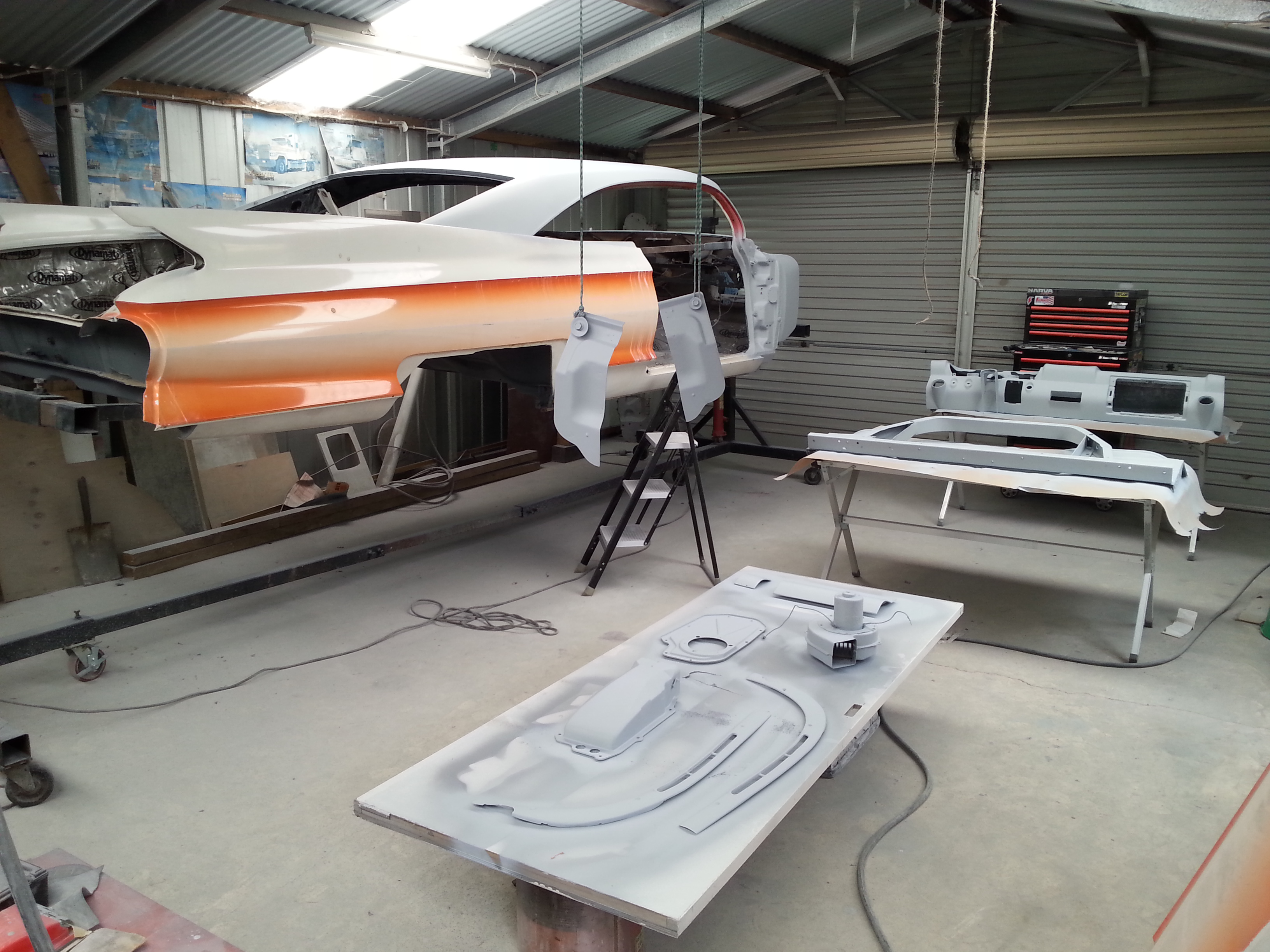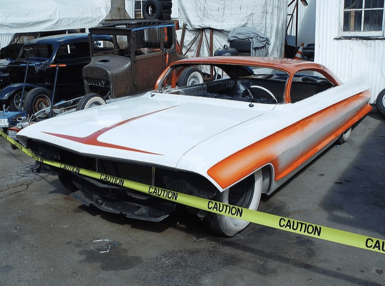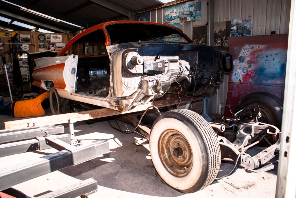As we explored the workshop, I ventured out to the back, always in search of hidden treasures. And there, amidst the unfinished projects, a striking sixties classic caught my eye. The meticulously chopped roof and vibrant orange and white paint job instantly captivated me. Little did I know that a casual remark to my friend Daryl would plant the seed of possibility in my mind. He suggested that I should be the one to bring this beauty to completion, and suddenly, my imagination soared.