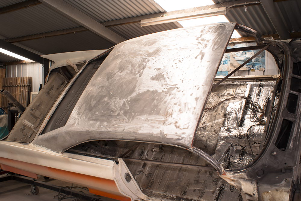 Luckily, the rotisserie proved invaluable for this job. I positioned the body on its side so that I could work on the roof directly. Using a combination of paint stripper and stripping pads on the grinder, I began the laborious process of removing the layers of paint and filler, going all the way back to bare metal. As I stripped it down, I could see how the roof was originally fitted to the body through various welded sections. Once stripped, it was time to apply fresh filler along both flanks of the roof and the rear section. I can’t even begin to count the number of full days I spent on this task, but eventually, I achieved a smooth finish and prepared the roof for the top coat.