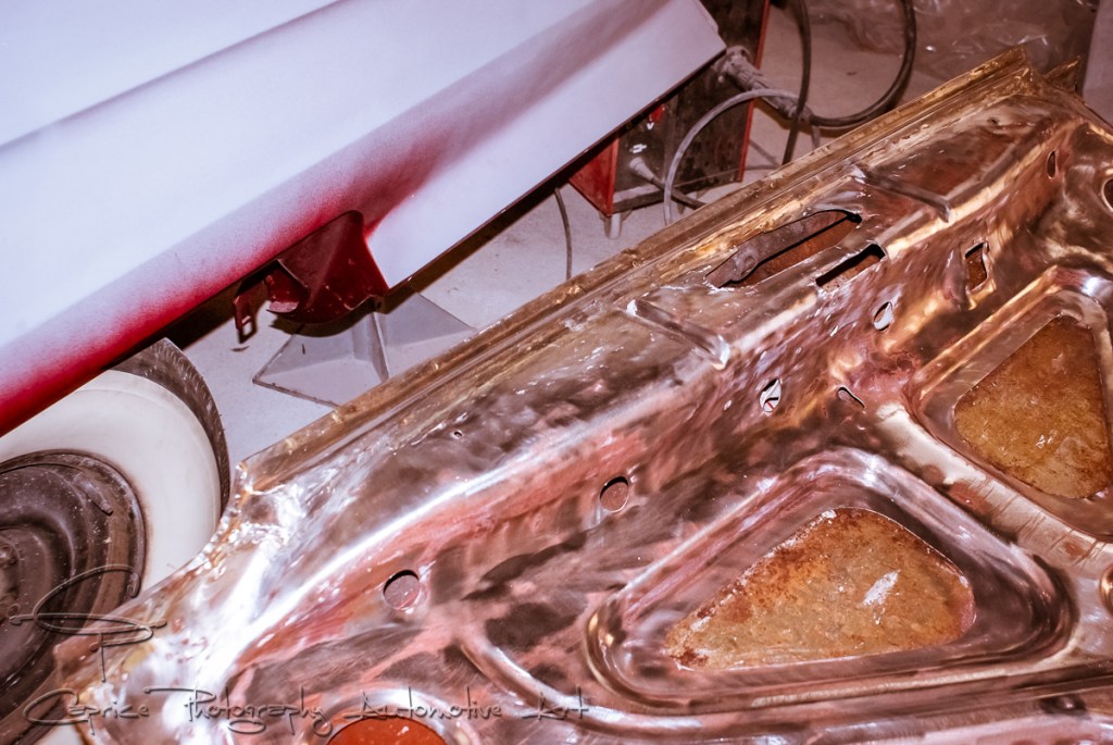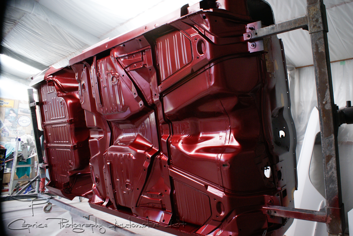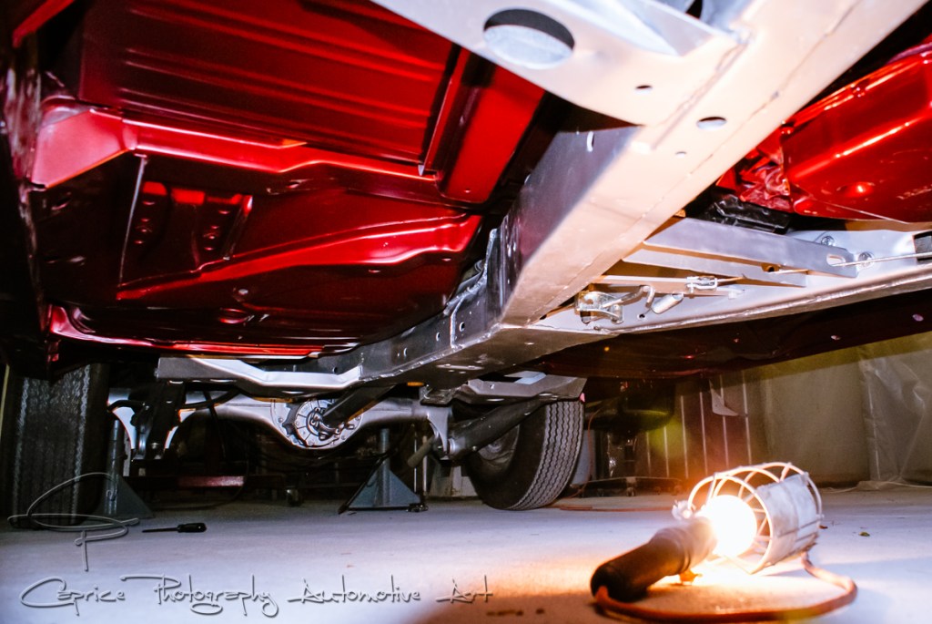 A job I had eagerly anticipated was finally applying the chosen color to the body. With the underside finished and prepared for painting, I took advantage of the rotisserie’s versatility to ensure full coverage in every corner and crevice. I opted for a satin finish on the underside to avoid making the floor appear too busy with a glossy shine. I must say, I’m quite pleased with the final look as it exudes a rich, old leather-like appearance. With coats of base, color, and clear, all applied while rotating the body from left to right, it made for a long day, but the results were undeniably rewarding.