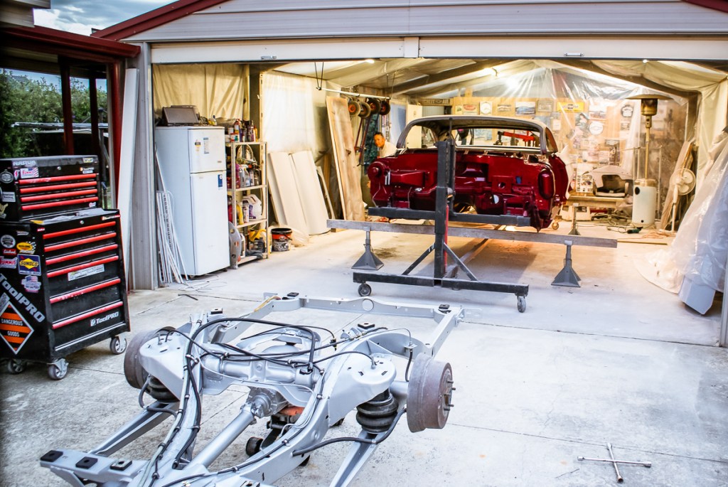 Once the underside was completed and the chassis fully set up, it was time to carefully lower the body back into its rightful place, giving me something that finally resembled a car again! I enlisted the same crew of mates who helped me lift the body off back in 2015 to assist with this task. Daryl and Frankie were spot-on, and we managed to complete the job without any issues in just a few hours. It was a gratifying feeling to be able to remove the bracing inside the body and gain some much-needed space in the garage by bidding farewell to the rotisserie. With a good sweep of the garage floor, I could finally sit back with a beer in hand and admire the rolling body parked centrally in the garage. Another milestone successfully completed!
