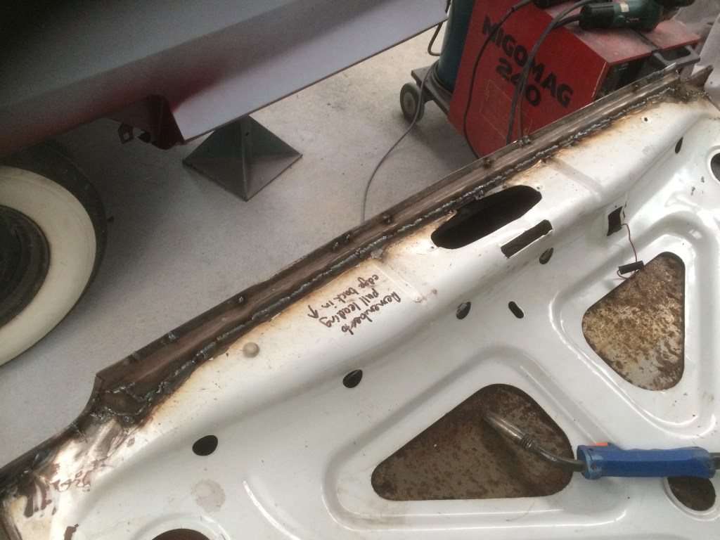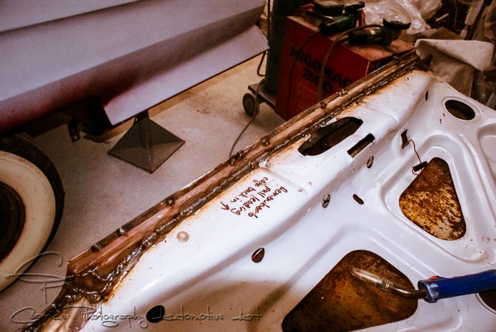 One panel I was not able to do while the body was on the rotisserie was the boot as it fouled with the frame when mounted on the car. Due to damage done in transit and rust issues, I had to cut out the back end of the boot on both the inner and outer panels before passing the rusted pieces off to another mate, Al to be used as templates for the new sections to be shaped in his folding and shrinking machines. I knew this was going to be a big job and time consuming. I didn’t want it to linger on so I attacked the panel in a marathon effort running over a four day break! With plenty of fitting, cutting, tacking, refitting, cursing, bending, hammer and dollying and realigning, I had the sections in to the point I could remove the boot from the car before welding and grinding up the repairs. I extended the lower lip down to sit closer to the alloy fill panels for a neater look. Some filler and high fill, and that’s the last panel done!