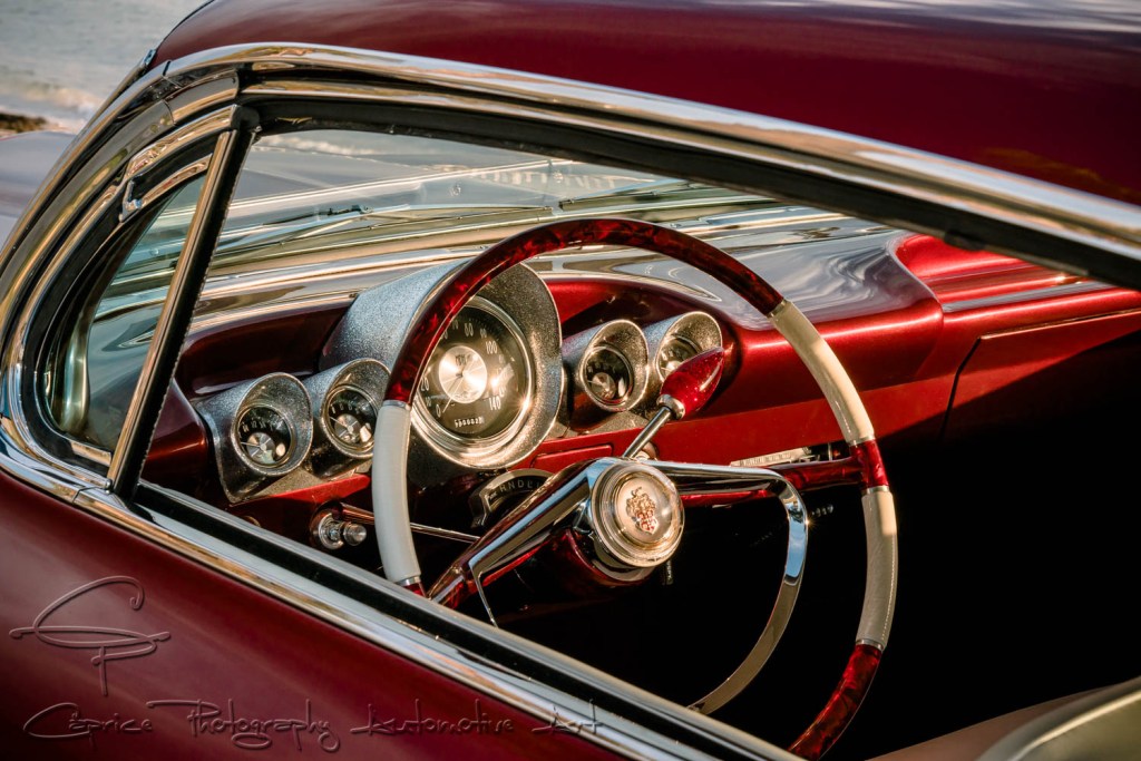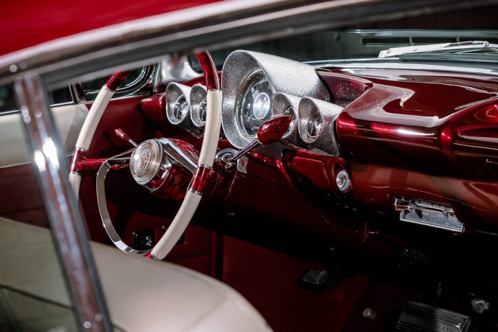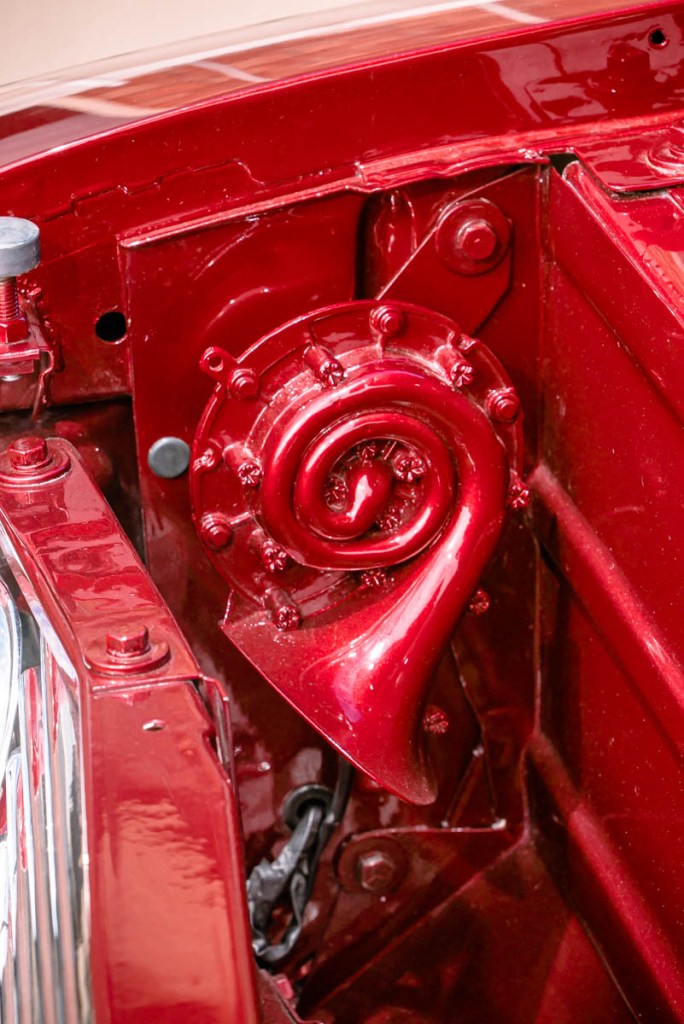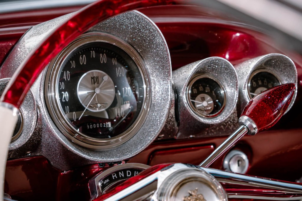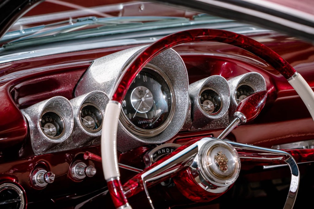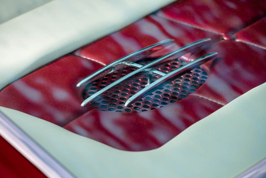 I thought it looked cool and also liked the fact it had an impressive crest in the center of the horn ring. After some research, I was excited to discover the wheel came from a 1956 Packard. Another marque added to the list of brands making up Rebelene’s DNA. I had Pat from Pearlcraft bring the wheel up to scratch with his stunning handywork.