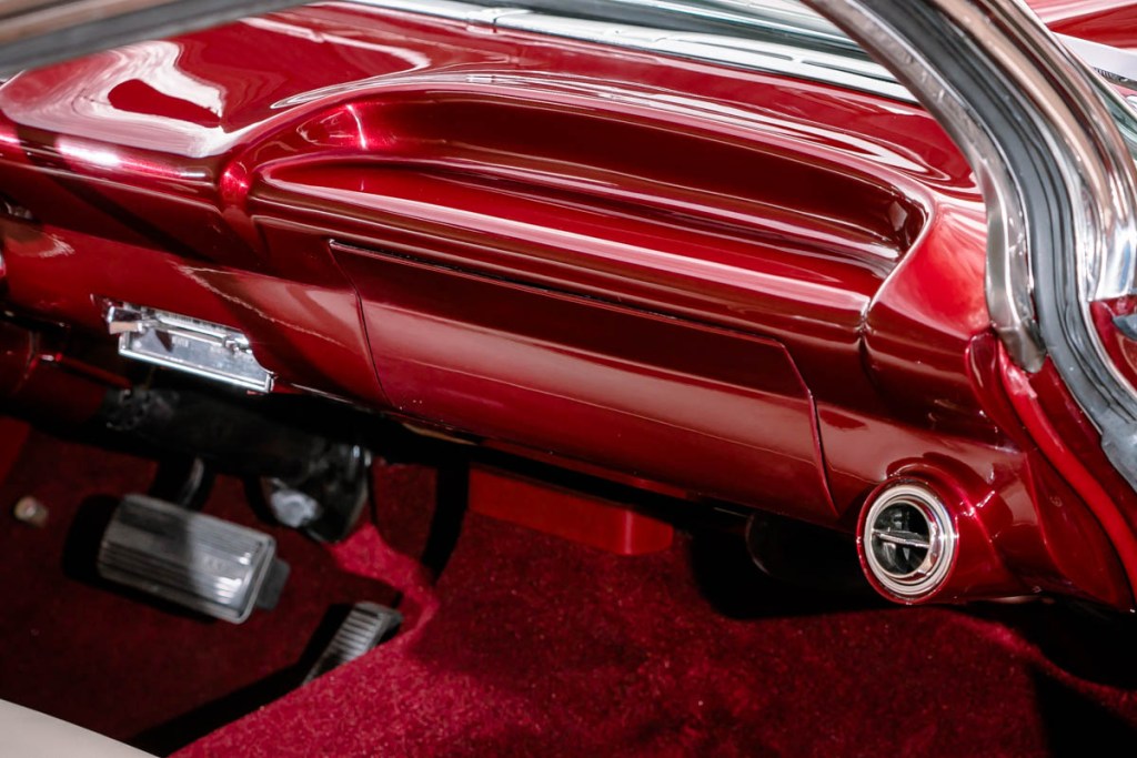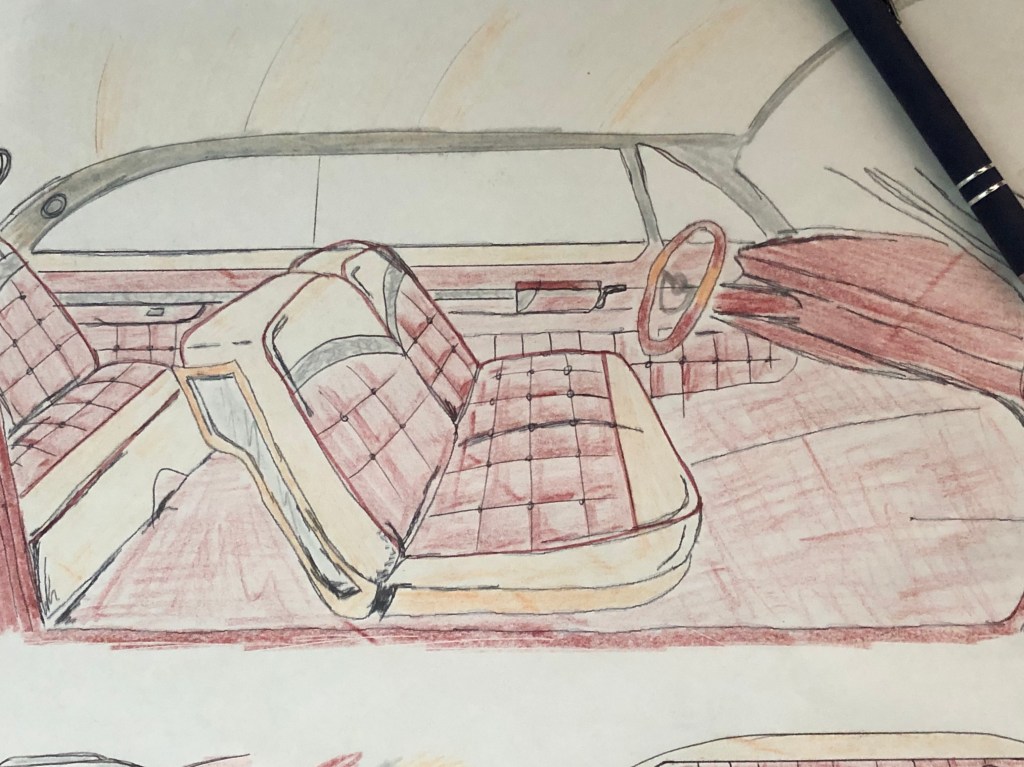 When it came to designing the rest of the interior, I sat down with a handful of blank sketches of a stock 61 Cadillac interior. Using pens and coloured pencils, I played around with ideas until I came up with a design that I liked. I wanted the interior to not look like a Cadillac interior yet still encapsulate the luxury of the big finned car while also paying homage to the kustom stylings of the era.