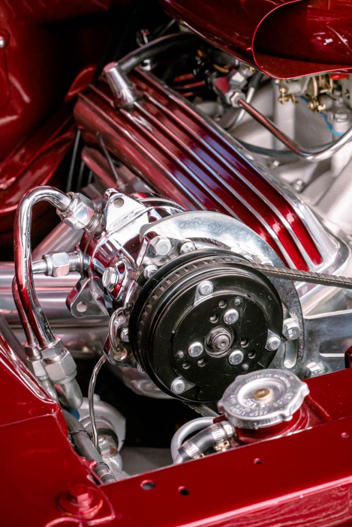 When it comes to creating your ideal engine bay and keeping it as period correct as you can, you’re met with numerous challenges along the way. To keep with the sixties kustom era, I knew all billet items were out and old school chrome was in. Previous cars I’ve gone very heavy on the chrome and polished alloy but, as kustoms go, they look better with their bonnet down than up, I took a big step back from the shiny bits and kept it to a minimum (Although this may change in future plans).