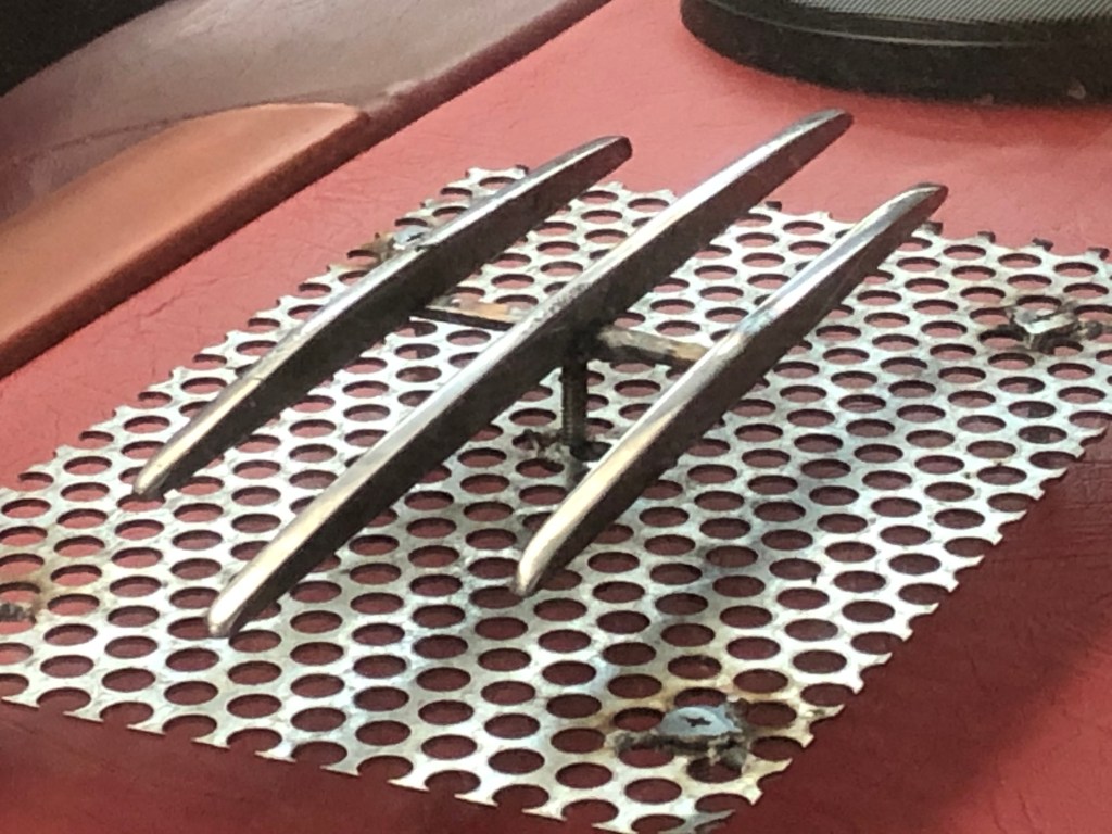 The audio in Rebelene is there mainly to be heard and not seen. A hidden bluetooth audio unit is mounted under the dash. Having said that, you can’t hide speakers easily so the front pair are in the kick panels while the rear pair in the parcel shelf have kustom one speaker grills. I created these floating bar style speaker grills to compliment the floating bar grill.