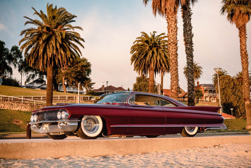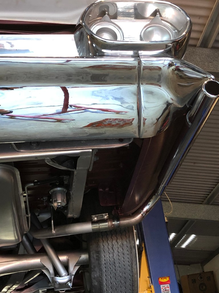 The challenge with the exhaust on the Caddy is that it is airbagged so clearance had to be taken into consideration as well as the factory X-chassis so no crossovers. I assisted with the construction and we utilised the original exhaust opening through parts of the chassis. We went from 3 inch primaries down to the 1 7/8th size pipes for the ends of the Bellflower tips.