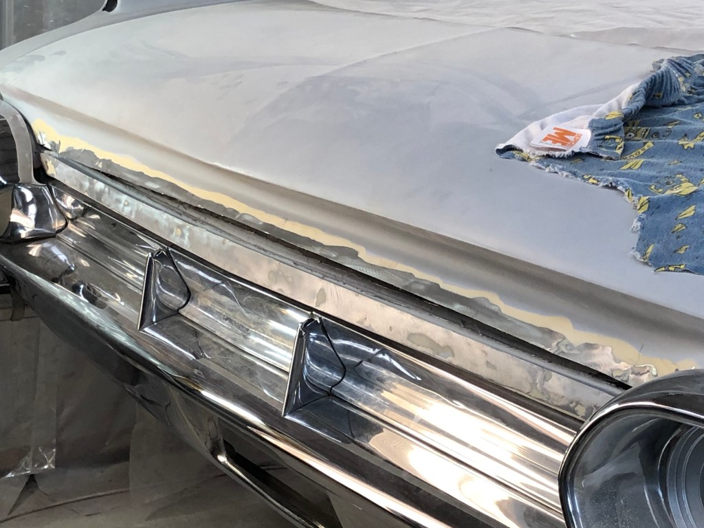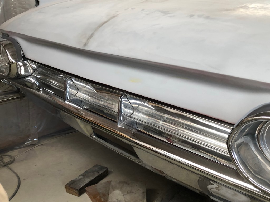 Despite the challenges, I managed to find time last year to work on the panels and bring them to the point where they are ready for paint. Let me tell you, this car is massive! I now have a newfound respect for those who bring these oversized machines to the high standard seen at car shows. The bonnet, although it appeared decent with its faded white paint, turned out to be far from straight. It required a significant amount of work to bring it back to an acceptable finish. Wet rubbing back all that high fill on the expansive surface felt like traversing the salt flats of Bonneville!