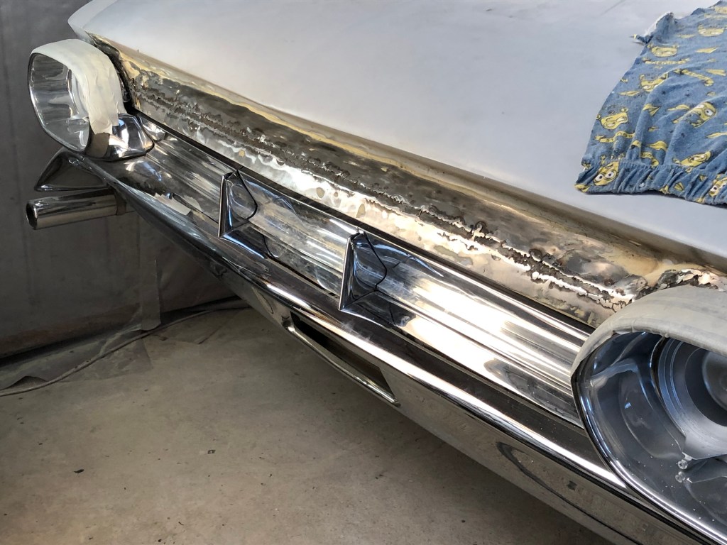 In addition to the roof, I continued working on various other parts of the car. I focused on welding and smoothing unwanted areas that would be visible when the car is on display. The radiator support panel, which consisted of six separate sections bolted together, puzzled me. I decided to weld all the sections together and box off the lower brace to create a cleaner and smoother appearance that would also be easier to clean. I also addressed the inner guards by filling in unused holes and stamping marks, giving them a cleaner look.