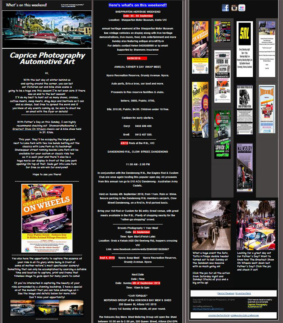 Everything from cruise nights, car shows, rockabilly festivals, burnout comps, drag racing, truck shows, bike shows, swap meets and any other automotive based event I come across will be added into an email and sent to you completely for FREE!